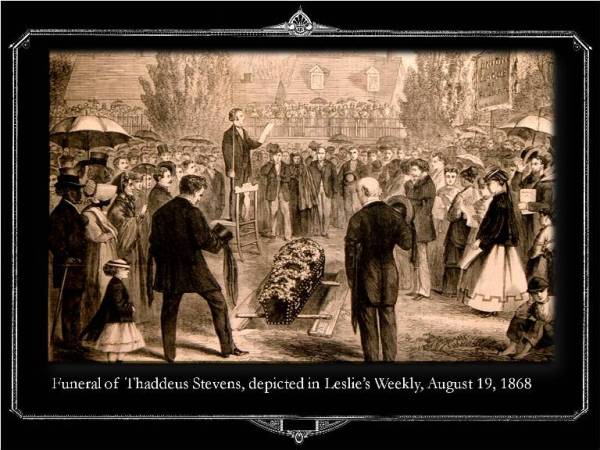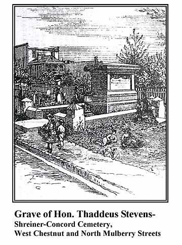 “Mr. Stevens died at Washington on August 11, 1868, and he was buried in Shreiner's Cemetery, in Lancaster, on August 15, 1868. He gave no directions in his will as to his place of burial, but it is said that he requested that he should be buried in this cemetery because the charters of the Lancaster and Woodward Hill Cemeteries, in which he had had lots, restricted interments to white persons. He prepared his own epitaph, which is upon his tomb. True to those principles of equality which he steadfastly maintained in life…he wished to repose in a plot where no limitations prevailed as to color, race or creed.